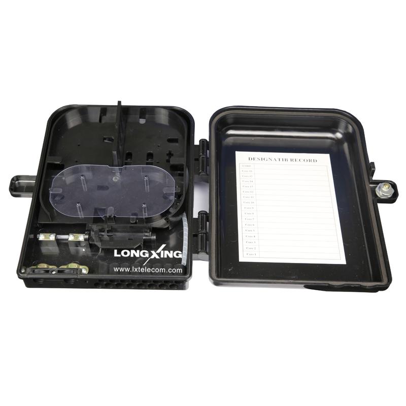 This distribution box terminates up to 2 fiber optic cables, offers spaces for